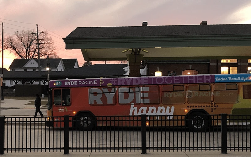 The BUS was re-branded as RYDE Racine in June 2017, and buses received an upgraded look featuring bold graphics, as seen in this view on December 21, 2020 at the Transit Center on Liberty Street in Racine. Keith M. Kohlmann photo.