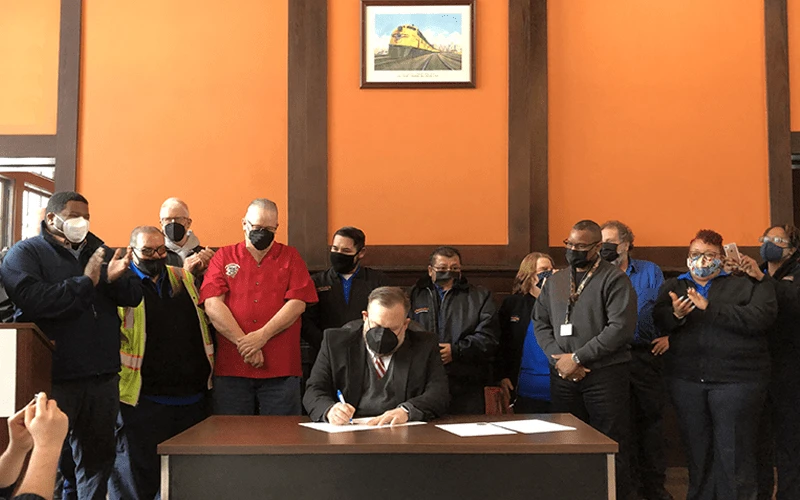 Members of the Teamster’s Union Local 200 and city officials look on as Mayor Cory Mason signs the historic agreement bringing direct management of RYDE Racine under the control of the newly created Department of Transportation beginning February 1, 2022. Keith M. Kohlmann photo.