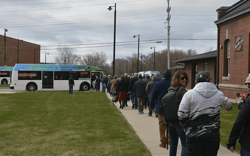 One of RYDE Racine’s cheerful drivers welcomes passengers aboard a new battery electric bus at the Racine Transit Center. The public was introduced to the 29-passenger buses and took their first demonstration rides on April 27, 2022. Keith M. Kohlmann photo.