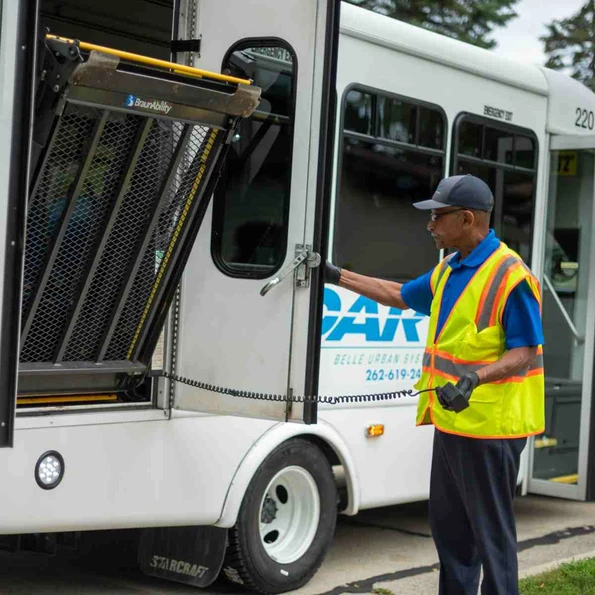 The Americans with Disabilities Act (ADA) requires public transportation programs to service individuals using a mobility device if the lift and vehicle can physically accommodate the customer. All RYDE Racine and Dial-a-Ride Transportation (DART) vehicles are accessible and equipped with either a lift (paratransit) or a ramp (fixed-route) with seating capacity for up to two (2) mobility devices. Lifts and ramps may also be used by customers with limited mobility at their request. RYDE Racine fixed-route buses also feature a chime and light-up sign when a bus stop request has been made to accommodate visually and hearing impaired customers. These buses also feature reserved seating near the entrance door and must be vacated at the request of a disabled customer or customer requiring the use of these seats. RYDE Racine buses also “kneel” making it easier for customers when boarding or alighting the bus