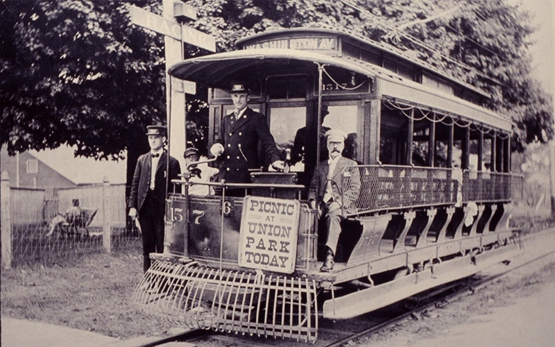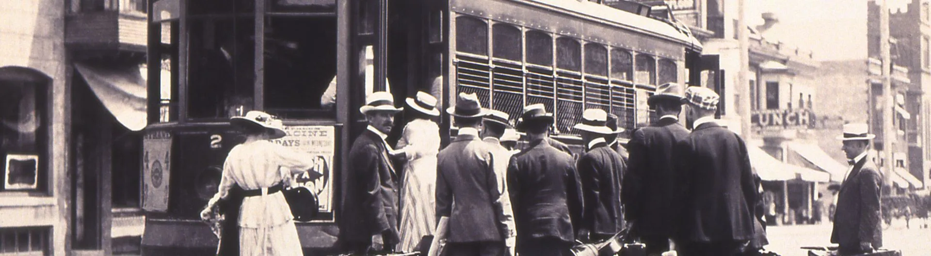 Musicians board the streetcar with their instruments at the Chicago & North Western Railway station on State Street in Racine in 1905. This location is now the Racine Transit Center.